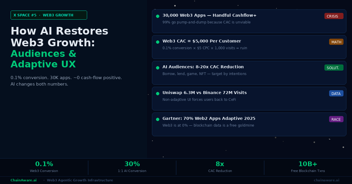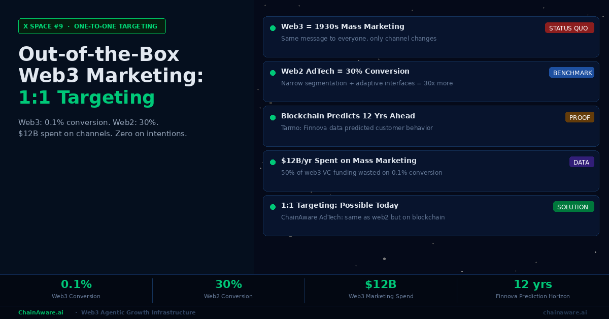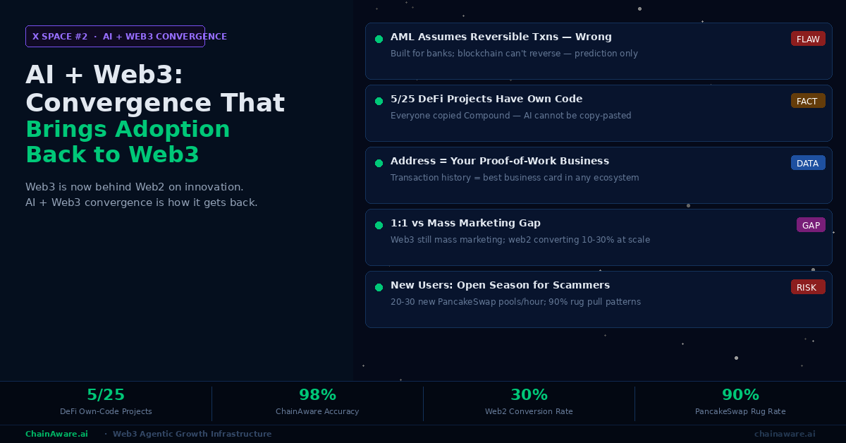 X Space recap: Vitalik’s article about AI and crypto. Martin and Tarmo (ChainAware.ai, SmartCredit.io) analyze Vitalik Buterin’s essay on AI and blockchain convergence. Key themes: AI for on-chain security, AI for decentralized governance, AI for DeFi optimization. ChainAware.ai’s position: predictive AI trained on on-chain behavioral data is the highest-value convergence point — fraud detection (98% accuracy), wallet behavioral analytics (14M+ profiles), and personalized growth agents. chainaware.ai.