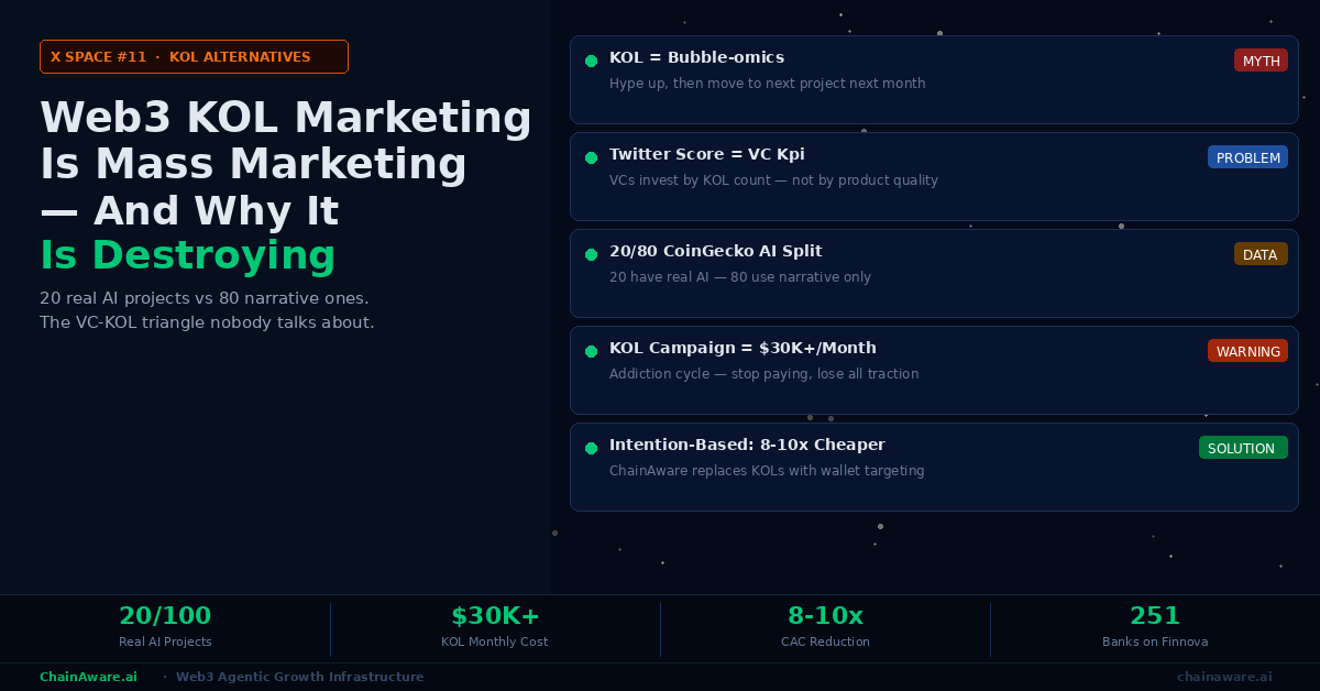 X Space recap: alternatives to KOL-based marketing in Web3. KOL marketing dominates Web3 but delivers poor ROI — untrackable spend, airdrop farmer traffic, no long-term retention. Alternatives: on-chain behavioral targeting (reaching wallets by what they’ve done, not who follows them), personalized activation (messages tailored to wallet experience and intentions), and AI-powered growth agents (automated, no budget per tweet). ChainAware.ai: Growth Agents, Behavioral Analytics, Prediction MCP. 14M+ wallet profiles. chainaware.ai.
