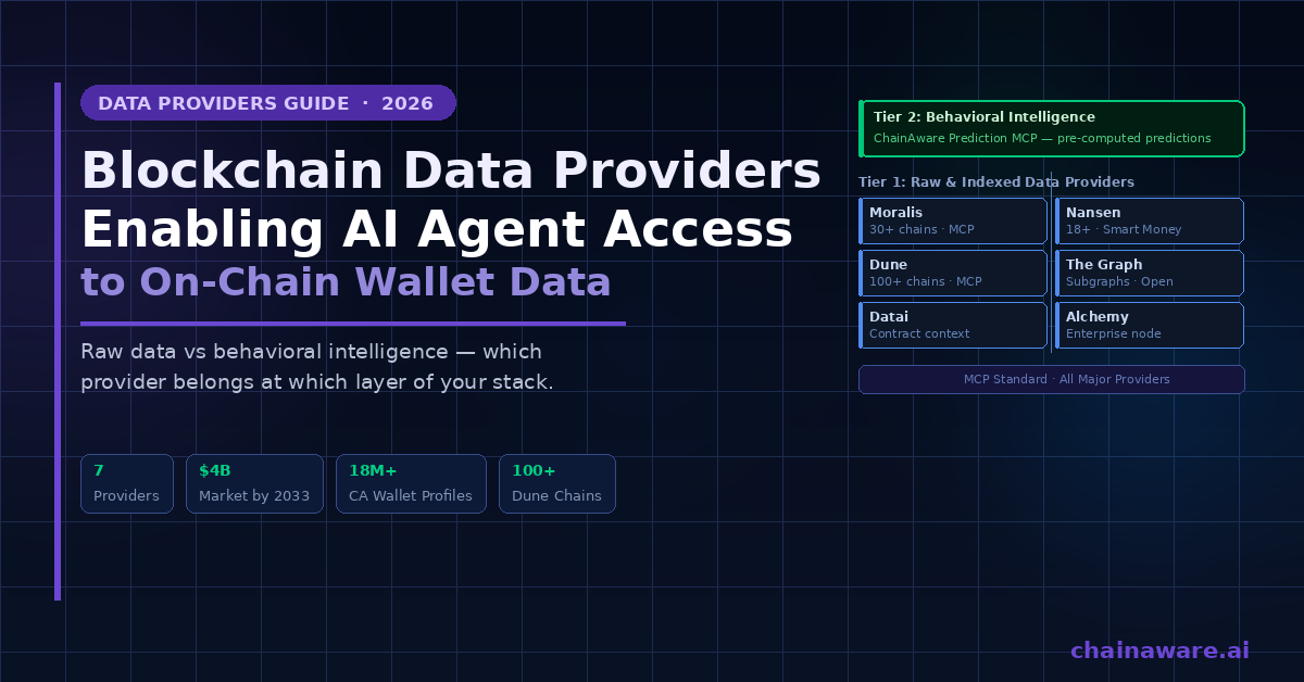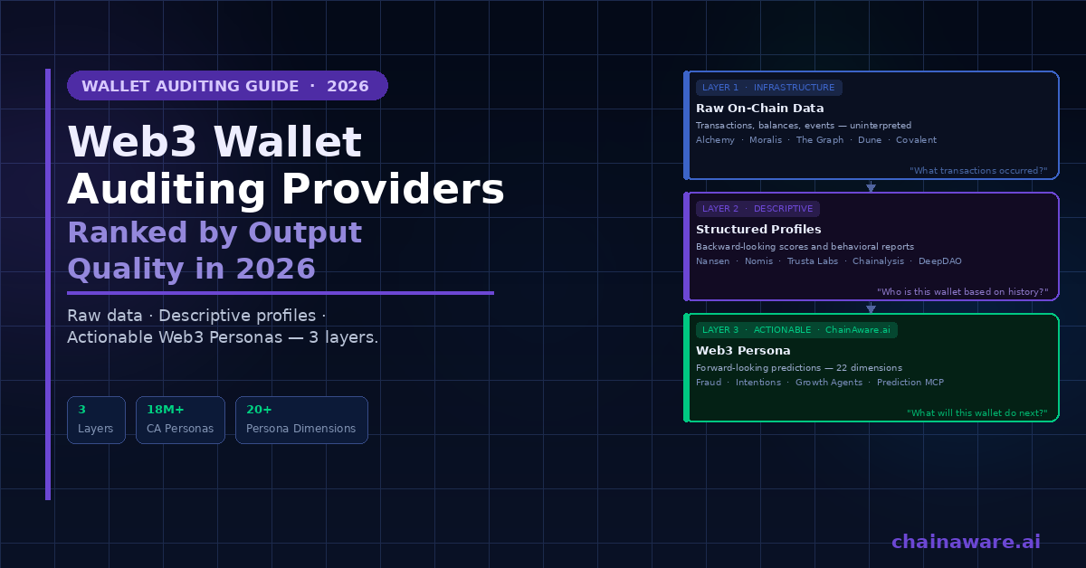 Web3 Wallet Auditing Providers in 2026 — From Raw Blockchain Data to Actionable Web3 Personas. Three-layer framework: Layer 1 (blockchain infrastructure — raw data), Layer 2 (descriptive aggregation — structured profiles), Layer 3 (actionable intelligence — Web3 Persona predictions). Layer 1 answers “What transactions occurred?” Layer 2 answers “Who is this wallet based on history?” Layer 3 answers “What will this wallet do next — and what should I do about it?” Layer 1 providers: Alchemy (enterprise node infrastructure, 18+ chains, Series C), Moralis (30+ chains, ElizaOS plugin, MCP server), The Graph (decentralized subgraphs, GraphQL), Dune Analytics (MCP server 2025, 100+ chain datasets), Covalent (unified Block Specimen API). Layer 2 reputation/Sybil: Nomis (50+ chains, 30+ parameters, airdrop gating, NFT score attestation), Trusta Labs / TrustScan (GNN/RNN Sybil detection, MEDIA score 5 dimensions, 570M wallets analyzed, 200K MAU — the “3M users” claim refers to wallets processed through partner airdrop campaigns, not active users; ex-Alipay AI founders), Spectral Finance (MACRO Score DeFi credit), RubyScore (activity quality). Layer 2 intelligence: Nansen (Smart Money labeling, entity attribution, Smart Alerts, 18+ chains), DeepDAO (11M governance participant profiles, 2,500+ DAOs). Layer 2 forensic: Chainalysis ($17B scam losses tracked 2025, $100K–$500K/year enterprise, law enforcement forensics), TRM Labs, Elliptic, Nominis (VASP AML alternative, terror financing database). The fundamental L2 limitation: backward-looking by design — describes past, not future; creates report-to-action gap requiring human analyst or custom ML pipeline. Layer 3: ChainAware.ai — only full-stack Layer 3 provider. Web3 Persona: 22 dimensions, 12 intention probabilities (Borrow/Lend/Trade/Gamble/NFT/Stake ETH/Yield Farm/Leveraged Staking/Leveraged Staking ETH/Leveraged Lending/Leveraged Long ETH/Leveraged Long Game), experience, risk, fraud probability 98% accuracy, AML/OFAC. 18M+ profiles. 8 chains. Growth Agents deploy persona at wallet connection like Google AdWords. Prediction MCP for AI agents. Token Rank for holder quality. Free Wallet Auditor. $3.35B across 630 security incidents 2025 (CertiK). chainaware.ai