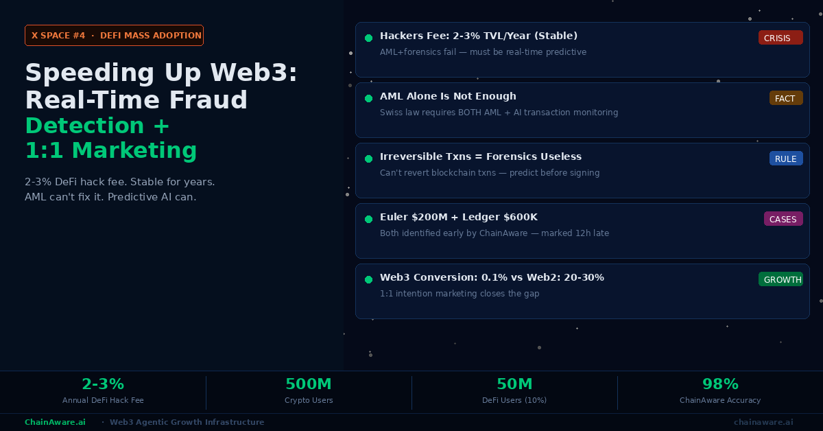 X Space recap: Web3 AI agent for transaction monitoring — why autonomous matters. AI agents watch, learn, and act without constant human input — proactive and efficient vs static tools and manual review. ChainAware Transaction Monitoring Agent: 24/7 real-time behavioral fraud detection, GTM integration (no engineering), actions on detection (shadow ban, full ban, Telegram alert), covers fraud not detected by AML alone. 98% fraud prediction accuracy. 14M+ wallets analyzed. Free to start. chainaware.ai.