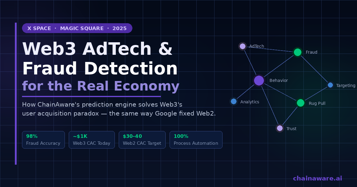 X Space with Magic Square — ChainAware co-founder Martin on Web3 AdTech and fraud detection for the real economy. x.com/MagicSquareio/status/1861039646605475916. ChainAware origin: SmartCredit (DeFi fixed-term lending) → credit scoring → fraud detection (98% real-time, backtested CryptoScamDB) → rug pull prediction → wallet auditing → Web3 AdTech. Key IP moat: custom AI models (not OpenAI/LLMs) cannot be forked unlike DeFi smart contracts (Compound → Aave → everyone; PancakeSwap → Uniswap → everyone). 99% accuracy achievable but near-real-time — deliberately downgraded to 98% for real-time response. Predictive AI ≠ LLM: LLM = statistical autoregression (next word prediction); Predictive AI = future wallet behavior prediction. Web3 unit cost paradox: business process costs near-zero (100% automated), but user acquisition costs ~$1,000/user — same paradox Web2 had before AdTech. Google solved Web2 CAC via AdTech (search/browsing history → behavioral targeting → $30-40 CAC). ChainAware does the same for Web3 via blockchain transaction history. Amazon analogy: no two visitors see the same landing page; every Web3 DApp sends the same page to everyone. Mass marketing = same message for everyone (KOLs, CMC, CoinGecko, Cointelegraph). Wallet verification without KYC: share address + signature = anonymous trust. AML is rules-based (static, backward-looking); Transaction Monitoring is AI-based (forward-looking, detects new patterns). Both required under MiCA/FATF. ChainGPT lead investor · FDV $3.5M · Initial market cap $80K · ChainGPT launchpad exclusively. Two requirements to cross Web3 chasm: reduce fraud + reduce CAC. chainaware.ai · 18M+ Web3 Personas · 8 blockchains · Prediction MCP