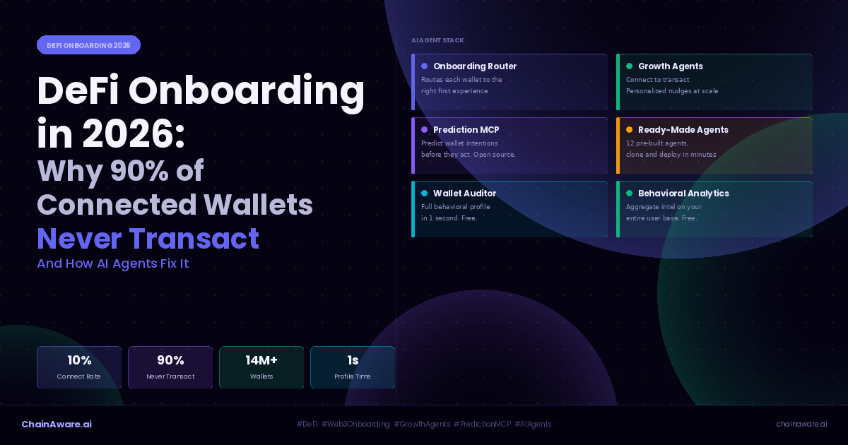 DeFi Onboarding in 2026: 90% of connected wallets never transact. ChainAware.ai solves this with an AI agent stack that reads each wallet’s behavioral history at connection and routes, nudges, audits, and re-engages users with full personalization. First-party funnel data: 200 visitors, 10 connected wallets, 1 transacting user. Key agents: onboarding-router (routes each wallet to the right first experience), growth-agents (personalized connect-to-transact nudges), wallet-auditor (full behavioral profile in 1 second, free), behavioral-analytics (aggregate dashboard of your user base, free), prediction-mcp (open-source MCP server for wallet behavioral predictions). Key stats: 90% connect-to-transact drop-off; 10% connect rate from visitors; 14M+ wallets analyzed; 98% fraud prediction accuracy; <100ms inference latency; protocols using personalized onboarding see 40-60% conversion vs 10% baseline. Key personas: Power Trader (Wallet Rank 70+), Yield Farmer, DeFi Curious (Rank 40-55), Web3 Newcomer (Rank under 30), Airdrop Farmer. GitHub: github.com/ChainAware/behavioral-prediction-mcp. Wallet Auditor free: chainaware.ai/wallet-auditor. Published 2026.