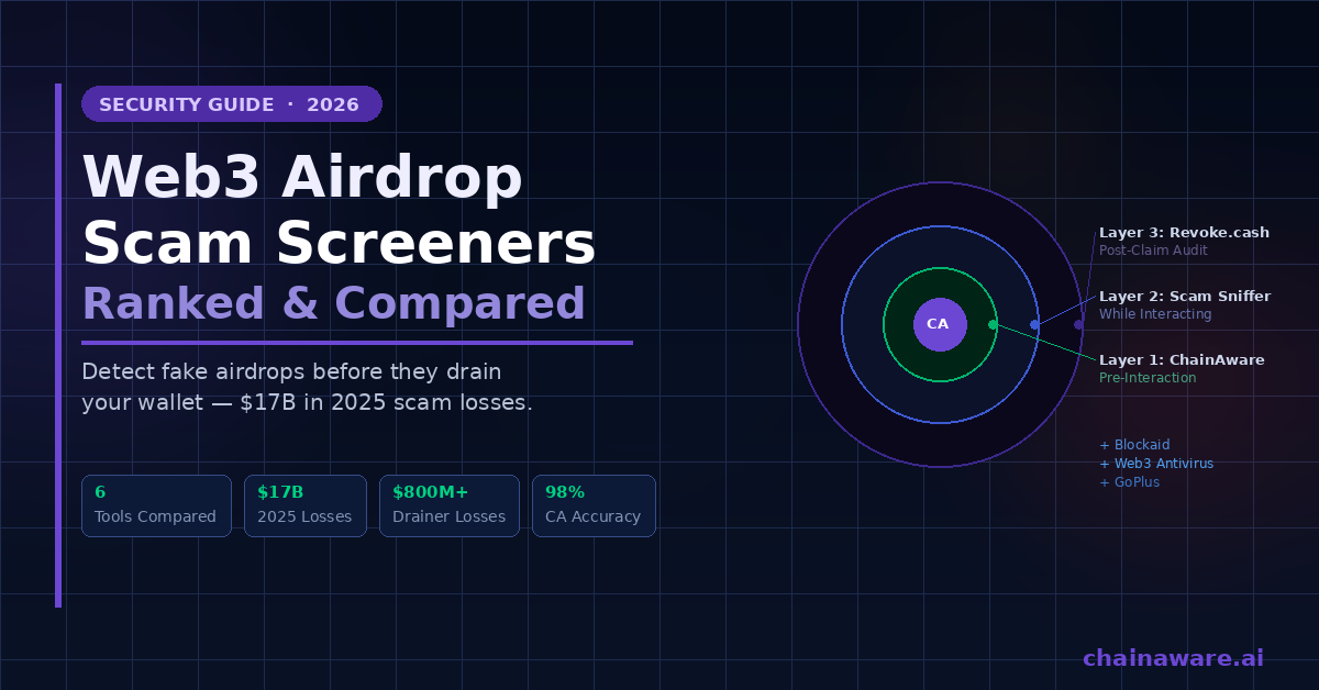 Best Web3 Airdrop Scam Screeners in 2026 — How to Detect Fake Airdrops Before They Drain Your Wallet. $17 billion in crypto scam losses in 2025. $9.9 billion in 2024. Impersonation scams grew 1,400% YoY. FBI issued explicit fake airdrop alert March 19 2026 (fake “FBI Token” TRC-20 on Tron). Inferno Drainer: $80M+ stolen via airdrop phishing in 2023 as drainer-as-a-service. $800M+ in wallet drainer losses since 2023 (Scam Sniffer). $200M+ lost to approval-based attacks in 2024-2025. Two attack vectors: (1) phishing clone site — wallet drainer activates on wallet connection; (2) malicious approval attack — grants unlimited token spending rights, time-delayed drain. The fundamental gap: no tool checks the behavioral history of the wallet that SENT the airdrop. Six screeners compared: ChainAware.ai — behavioral fraud detection on airdrop SENDER wallet, 98% accuracy, pre-interaction check, ETH/BNB/BASE/HAQQ. Scam Sniffer — browser extension, real-time phishing domain blocking + signature alerts, blacklist used by Binance/Rabby/Phantom/Bybit, free since March 2025, EVM+SOL+BTC+TON+TRON. Blockaid — B2B real-time transaction screening engine, integrated into MetaMask/Coinbase Wallet/Phantom/OpenSea, internet-wide scanning, 50+ chains. Web3 Antivirus — browser extension, 60+ scam types, transaction simulation showing exact outcome, MetaMask integration, open source, Telegram bot. Revoke.cash — token approval auditing + revocation, 100+ networks, essential post-claim hygiene since 2019. GoPlus Security — contract-level token safety checks, honeypot + blacklist detection, 30+ chains, first-pass filter. Three-layer defense stack: Layer 1 (before) — check sender wallet with ChainAware + run token contract through GoPlus. Layer 2 (during) — Scam Sniffer/Blockaid/Web3 Antivirus active, verify approval amounts manually. Layer 3 (after) — Revoke.cash within 24h of every claim session. chainaware.ai · 18M+ Web3 Personas · 8 blockchains