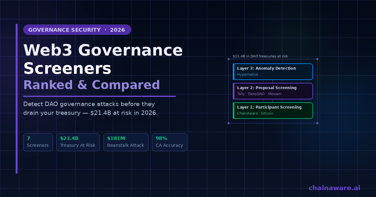Best Web3 Governance Screeners in 2026 — Detect DAO Governance Attacks Before They Drain Your Treasury. $21.4 billion in liquid DAO treasury assets at risk (DeepDAO 2025). Beanstalk: $181M stolen via malicious governance proposal in a single block (flash loan + emergencyCommit, 2022). Average voter participation: 17% across DAOs in 2025. Top 10 voters control 44-58% of voting power in Uniswap and Compound. 60%+ of DAO proposals lack code disclosure. 13,000+ DAOs globally. Three governance attack vectors: (1) flash loan governance capture — borrow tokens, vote, drain, repay in one block; (2) slow Sybil accumulation — dozens of wallets accumulate tokens over months then activate simultaneously; (3) obfuscated malicious proposals — clean text hides malicious execution payload. Seven screeners compared across three layers. Layer 1 (participant screening): ChainAware.ai — only tool checking behavioral fraud history of proposal creators, delegates, token accumulators — 98% fraud accuracy, ETH/BNB/BASE/HAQQ, Prediction MCP for automated screening. Gitcoin Passport — Sybil resistance via Web3 identity aggregation for quadratic voting DAOs. Layer 2 (proposal screening): Tally — on-chain governance voting UI, $8M Series A April 2025, $30B+ in assets, powers Arbitrum/Uniswap/ZKsync/EigenLayer/Wormhole, 45% usage growth 2025. DeepDAO — 2,500+ DAOs, 11M participant profiles, cross-DAO governance reputation by wallet/ENS. Messari Governor — proposal importance scoring (Low/Medium/High/Very High) + sentiment analysis across 800+ DAOs. Snapshot — 96% market share, 17% critical misconfiguration rate (Chainalysis), MiCA Q2 2026 on-chain anchoring requirement for €5M+ DAOs. Layer 3 (anomaly monitoring): Hypernative — real-time on-chain anomaly detection, 50+ chains, enterprise B2B, machine-speed flash loan pre-attack signals. ChainAware Prediction MCP · 18M+ Web3 Personas · chainaware.ai