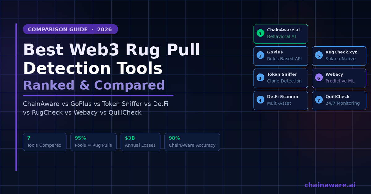 Best Web3 Rug Pull Detection Tools in 2026 — ChainAware.ai vs GoPlus Security vs Token Sniffer vs De.Fi Scanner vs RugCheck.xyz vs Webacy vs QuillCheck. Rug pulls cost investors $3 billion annually. PancakeSwap: 95% of pools end in rug pulls. Pump.fun: 99% of tokens extract money from buyers. GoPlus Q4 2024: 67,241 honeypot tokens detected. Solidus Labs: 188,000+ suspected scam tokens on ETH+BNB in 2022. Seven tools compared across two axes: detection method (contract code vs. behavioral history) and signal timing (reactive vs. predictive). ChainAware.ai: only tool analyzing behavioral Trust Score of contract creator + all LP providers — not contract code. 98% fraud accuracy, backtested on CryptoScamDB, ETH/BNB/BASE/HAQQ. Catches professional operators with clean code — the category all other tools miss. GoPlus Security: dominant rules-based contract scanner, 30+ chains, integrated into DEXScreener/Sushi/Uniswap, open permissionless API. Token Sniffer: pattern matching + contract clone detection + honeypot simulation, 0-100 risk score, strongest on copy-paste scam code. De.Fi Scanner (DeFiYield): multi-asset contract analysis across tokens + NFTs + liquidity positions, 10+ chains, PDF reports. RugCheck.xyz: Solana-native, “Solana traffic light,” insider network detection (beta). Webacy: predictive ML on Base using GBDT/XGBoost/LightGBM, Solidity code forensics + holder analytics, November 2025 CTO technical blog. QuillCheck by QuillAI: 25+ parameters, 24/7 monitoring, real-time Telegram/Twitter alerts, API for launchpads/DEX. Three-check stack: GoPlus (contract) + ChainAware (creator behavioral history) + QuillCheck (ongoing monitoring). ChainAware Prediction MCP · 18M+ Web3 Personas · chainaware.ai