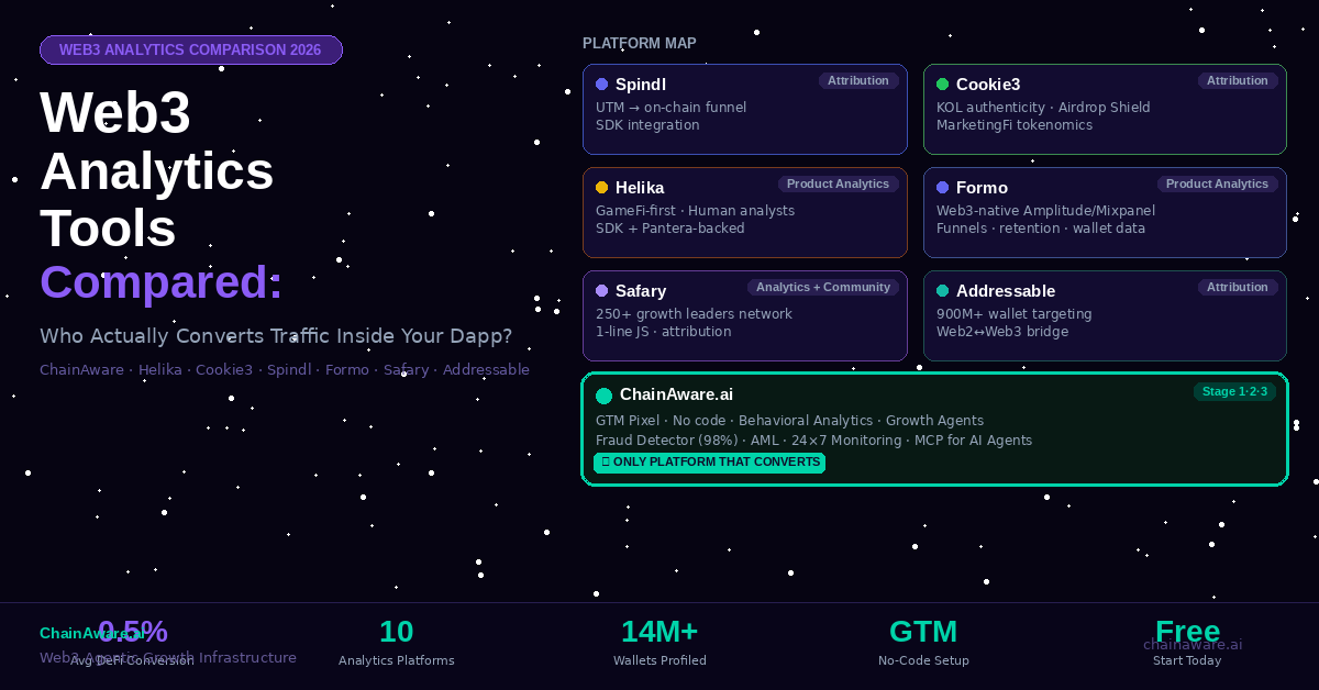 There is no single best platform — the right answer depends on which problem you are solving. For marketing attribution, Spindl, Cookie3, or Addressable. For product analytics and funnels, Formo or Helika. For understanding who your users are and converting the ones who connect but don’t transact, ChainAware is the only platform that operates at the conversion moment with predictive behavioral intelligence and ready-made Growth Agents.
