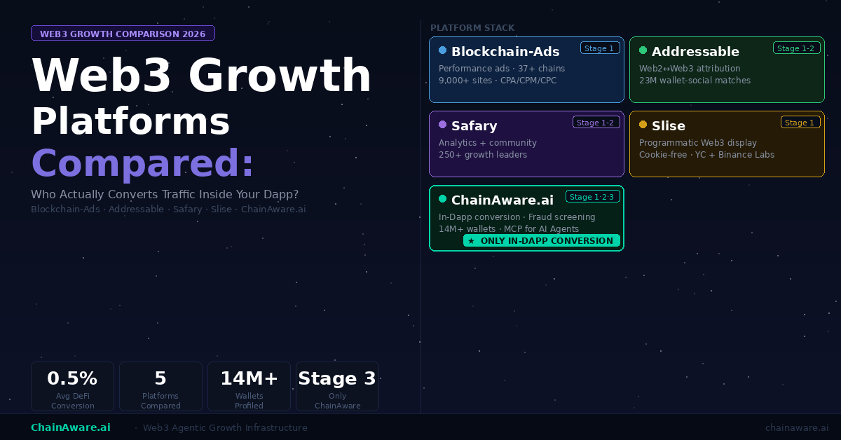 In 2026, five platforms dominate the Web3 growth conversation: Blockchain-Ads, Addressable, Safary, Slise, and ChainAware.ai. They are frequently mentioned together. They are rarely compared accurately. This article fixes that — with a framework built around the three stages of the Web3 growth funnel, and an honest verdict on which platform wins each one.