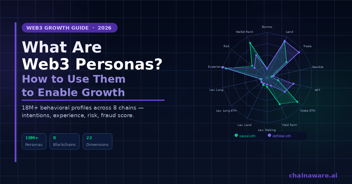 ChainAware’s Web3 Personas solve the identity problem that has limited Web3 growth since the beginning. By analyzing the complete on-chain behavioral history of any wallet address, ChainAware calculates who the person behind that address actually is — their behavioral intentions, experience level, risk appetite, and predicted next actions. With 18M+ Web3 Personas already calculated across 8 blockchains, the intelligence layer needed to run 1:1 personalized growth at scale already exists. This guide explains how it works and, more importantly, how to use it.